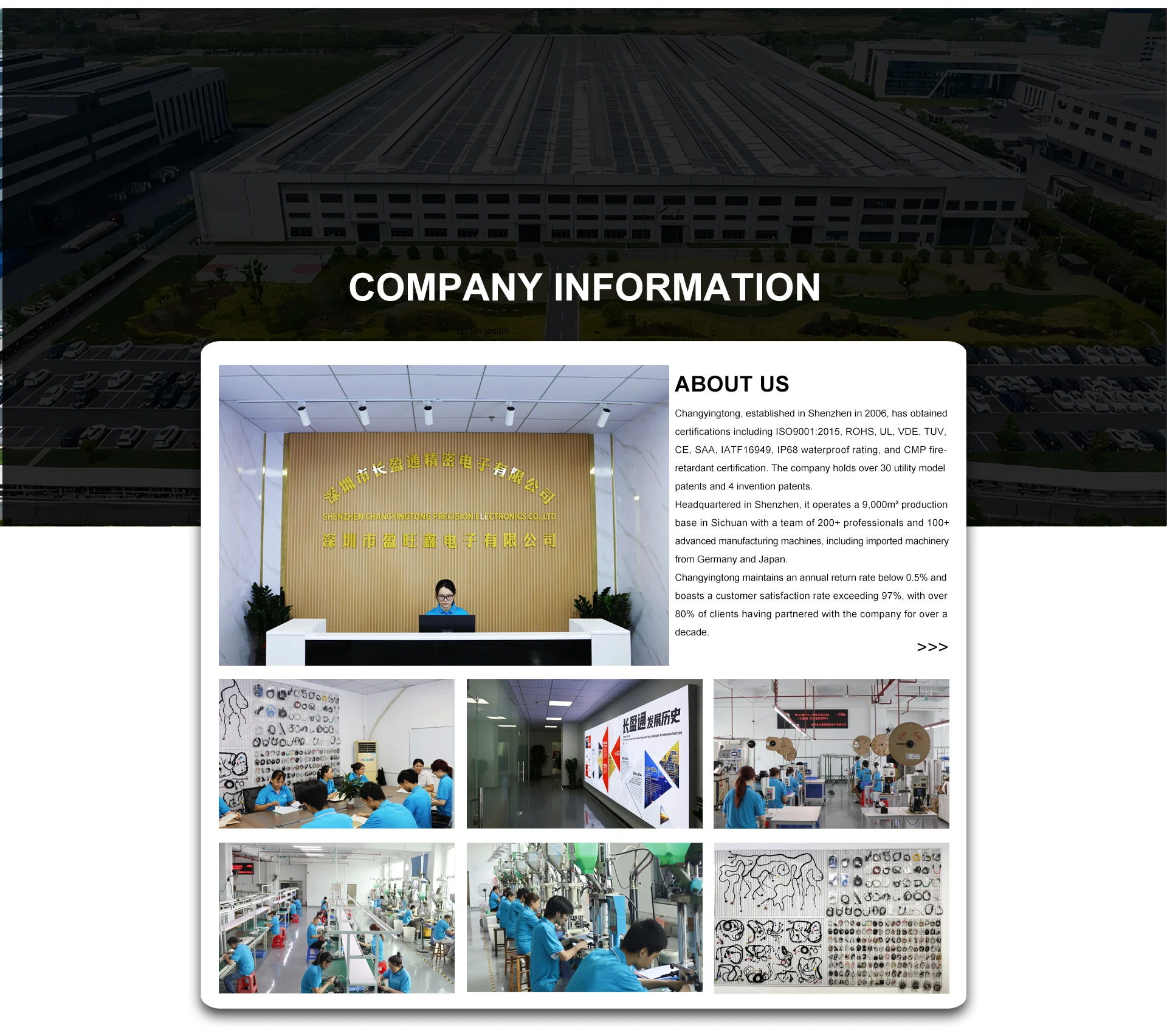 Founded in Shenzhen in 2006, we specialize in wire harness manufacturing. Our capabilities include standard wiring harnesses and customized integrated wiring harness solutions developed through scenario-based design for diverse applications.Certified with ISO 9001, UL, VDE, SAA, CE, and IATF 16949, we hold over 30 utility patents.  Our 9,000m² production facility in Sichuan is equipped with German-Japanese precision machinery and supported by a 200+ technical team delivering cutting-edge solutions.